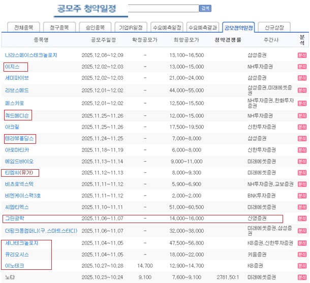 2025년 10~11월 공모주 청약 일정은 다음과 같다. 10월 중에는 노타와 이노테크 2개회사만 있었는데, 11월에는 상당히 많은 기업들이 공모를 준비 중에 있다. 요즘 증권시장이 활황을 보여 정리해 본다, 일반적으로 공모주에 대한 투자는 상장 후 당일 혹은 1-2일 후에는 매도하는 것이 좋다.